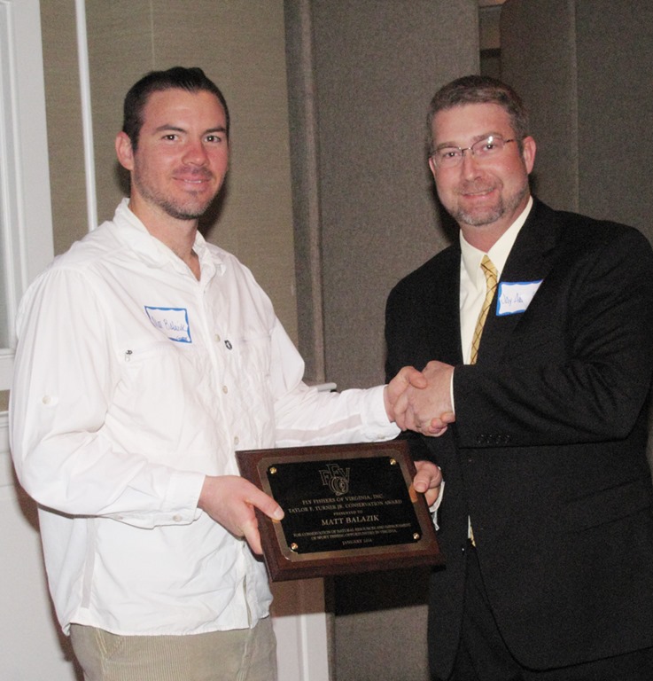 FFV conservation vice president Jay Armstrong awarded Matt Balazik the ‘Taylor Turner Conservation Award’ for his work with Sturgeons.